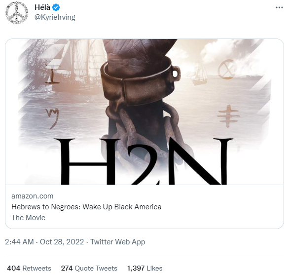 当地时间10月27日下午,欧文在推特和Instagram上分享了一部影片的亚马逊网站链接,该片名为《希伯来人到黑人:唤醒美国黑人》(Hebrews to Negroes: Wake Up Black America)。