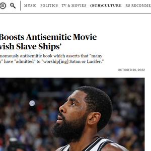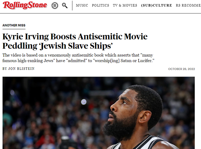 (观察者网讯)据美国娱乐与体育电视网(ESPN)10月28日报道,NBA布鲁克林篮网队球星凯里·欧文(Kyrie Irving)又搞事了,他27日在社交平台分享了一部纪录片。美国《滚石》杂志称该片改编自一本“充斥着反犹比喻”的书,影片提到“犹太人对社会各个方面的控制”,并强调犹太人参与了奴隶贸易。