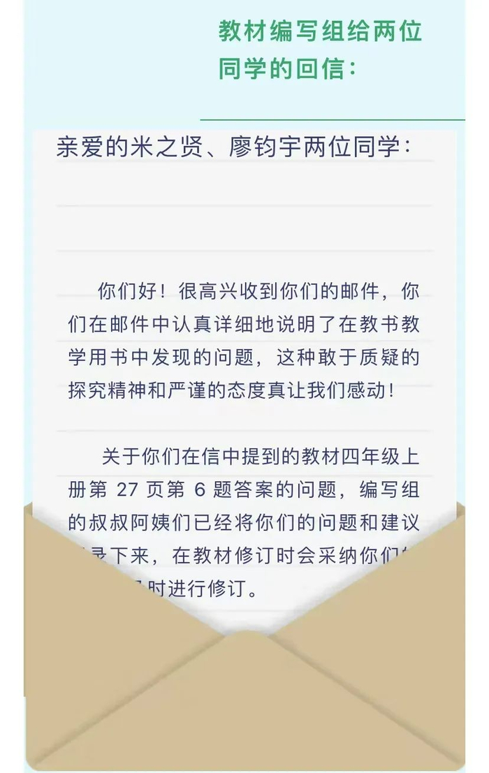 据红星新闻报道,近日,四川成都天府新区两名四年级学生成功推翻官方用书上的“标准”答案,给新世纪小学教材(北师大版)编写组发去了邮件,并收到了编写组的回信。回信中,教材编写组肯定了两名学生敢于质疑的探究精神和严谨的态度,同时表示,在教材修订时,会采纳他们的建议。