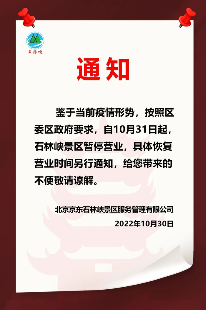 鉴于疫情形势,北京平谷石林峡景区暂停营业
