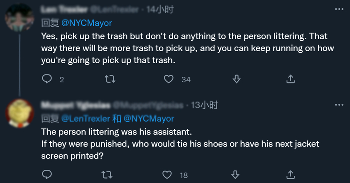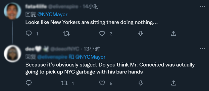 “因为这明显就是摆拍,你以为这位市长大人真的要徒手捡纽约市的垃圾吗?” 另一位回答。