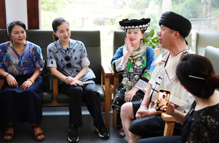 此次演出之余,中央歌剧院还在剧场大厅举行“神秘湘西,梦里边城”文旅融合展览,以生动的图片和文字向来宾展现湘西的优美风景和深邃文化,身着蜡染服饰的苗家姑娘动态展示非遗魅力,让观众获得沉浸式的观展和观演体验。
