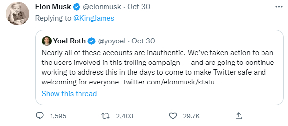 马斯克很快用推特安全主管约尔·罗斯的推文回复了詹姆斯。罗斯在推文中称,造成种族歧视言论数据激增的原因是在过去48小时内,“少数账户发布了大量推文”。