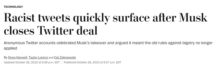 28日,《华盛顿邮报》发文称,马斯克入主推特后,种族主义推文迅速浮出水面。一群大胆的匿名用户发布了种族主义诽谤和纳粹表情包。尤其是前者,是马斯克时代推特“最显著的改变之一”。