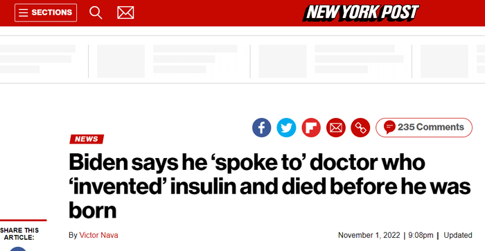 美媒:拜登说与胰岛素“发明”者谈过,但发现者已于拜登出生前去世