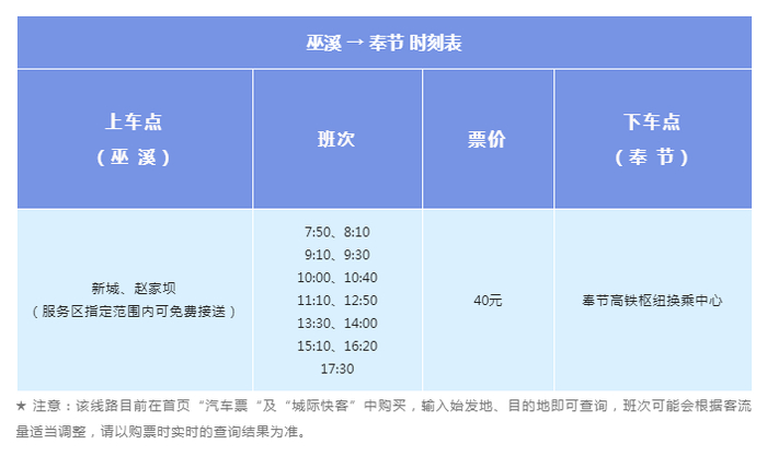 “巫溪→ 奉节”方向,巫溪在新城、赵家坝指定服务范围内免费上门接送。
