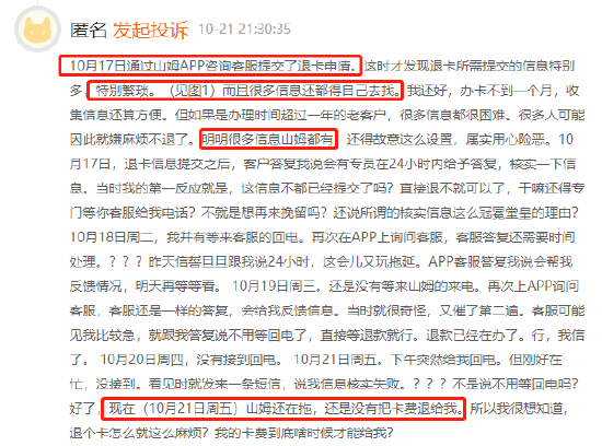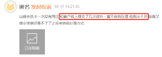 近期有多位消费者反馈,自己在办理山姆会员店会员卡后因各种原因需要退卡,但退卡流程极为繁琐,需要提交多种信息,询问客服退卡进度后客服也不断推脱并做出虚假承诺,未在承诺时段内进行回电及信息核实,退卡困难。同时还有多位完成了信息核实正式进入退卡流程的消费者表示,山姆会员店打款速度缓慢,在收到了退卡成功提示后,等待多日仍未收到退款。截止10月底山姆会员店累计收到投诉2893单,回复率不足60%。