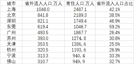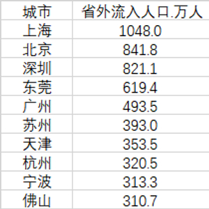 截至2020年,共有30个城市的省外流入人口超过了100万人,其中超过300万的有10个城市,分别是上海、北京、深圳、东莞、广州、苏州、天津、杭州、宁波和佛山,全部来自三大城市群。