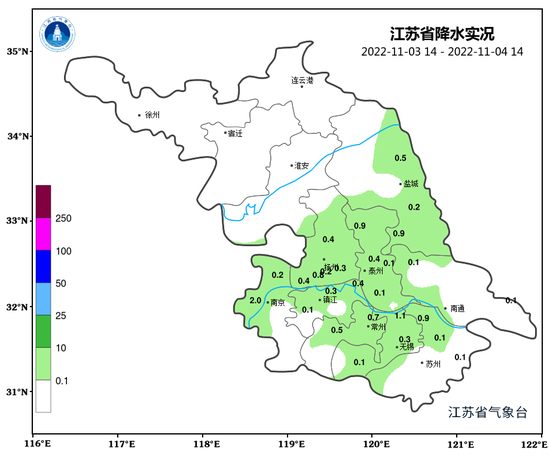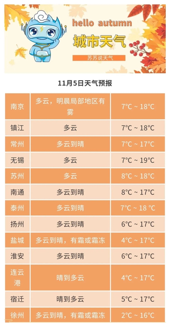 最低温度:淮北地区3~4℃,苏南地区7~8℃,其他地区6℃左右。全省东北风3-4级。