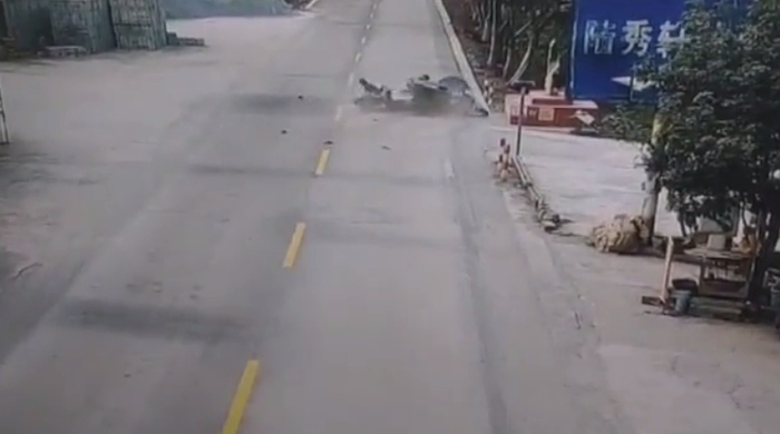 监控视频显示:碰撞发生时,二轮摩托车上两人腾空翻转后甩落地面,两车纷纷倒地,电动三轮车驾驶人躺在地上动弹不得。三人均未佩戴安全头盔。