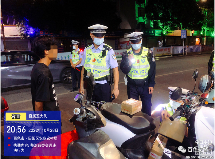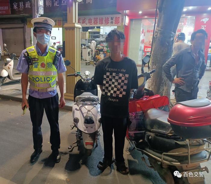 10月28日21时许,百色市公安局交警支队直属五大队在田阳区开展整治行动,一辆无号牌电动车驰速驶入检查区域,驾驶人脸蛋稚嫩且未佩戴安全头盔,民警见状立即示意其靠边停车接受检查。