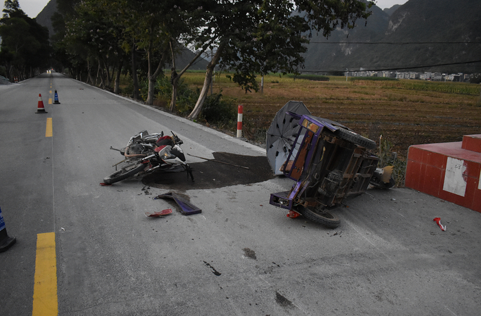 10月28日,河池市公安局交警支队东兰大队接到群众报警称:辖区三石镇纳合村弄友屯发生一起二轮摩托车与电动三轮车碰撞事故,现场有2人受伤。