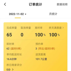 订单系统显示,11月2日,张某共完成65单外卖。受访者供图