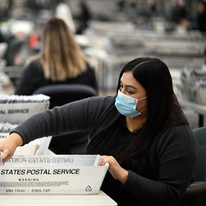 当地时间2022年11月4日,美国加州,在洛杉矶选举登记中心,选举工作人员正在为将于11月8日举行的美国中期选举准备邮寄选票。本文图片 人民视觉