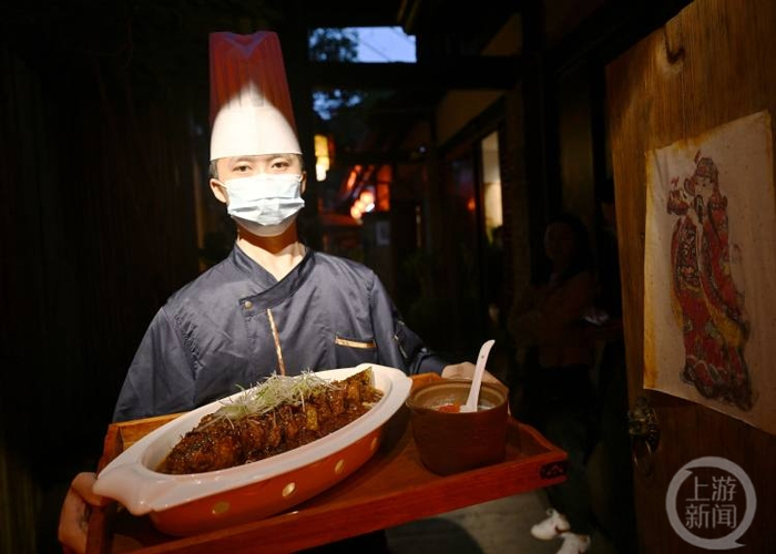 “重庆脆皮鱼”的调味品也都是老牌非遗产品,从“黄花园酱油”“江津烧酒”到“内江白糖”“自贡井盐”,甚至连装盘采用的餐具,也是来自重庆荣昌等地的非遗瓷陶器。
