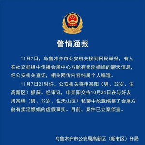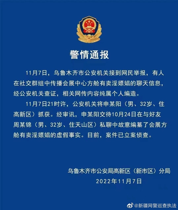 据@新疆网警巡查执法 通报,11月7日,乌鲁木齐市公安机关接到网民举报,有人在社交群组中传播会展中心方舱有卖淫嫖娼的聊天信息,经公安机关查证,相关网传内容纯属个人编造。