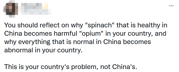 有人犀利反怼,“为什么在中国健康的‘菠菜’,到了美国就成了有害的‘鸦片’了?为什么所有在中国很正常的事情,一到你们国家就不正常了?美国人,你该反思啊。”