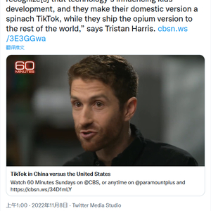 (观察者网讯)据美国CBS电视台《60分钟》8日报道,前谷歌设计伦理学家特里斯坦·哈里斯(Tristan Harris)在采访中谈论Facebook、Twitter等社交媒体为获取更大利益对美国网络用户进行算法“支配”。然而当谈及社媒对青少年儿童的影响时,他莫名拉出TikTok“甩锅”,宣称中国版抖音和海外版TikTok对孩子们所呈现的内容“差异极大”。