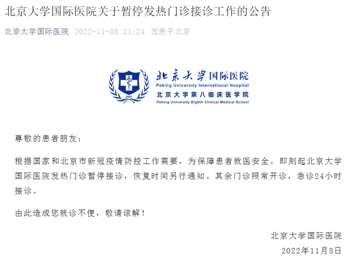 今晚,北京大学国际医院发布公告称,根据国家和北京市新冠疫情防控工作需要,为保障患者就医安全,即刻起北京大学国际医院发热门诊暂停接诊,恢复时间另行通知。其余门诊照常开诊,急诊24小时接诊。
