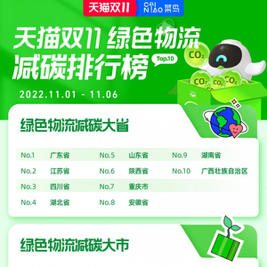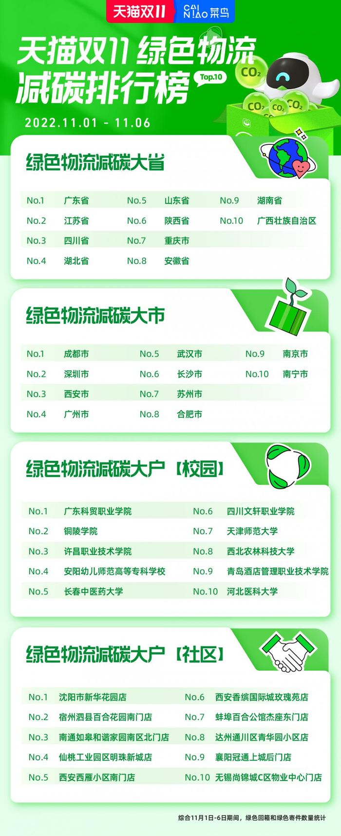 11月9日,菜鸟公布了11月1日到6日全国各省市自治区、地级市、高校和社区菜鸟驿站回收包装减碳排行榜:广东继续领跑减碳大省排行榜,与江苏、四川、湖北和山东等10个省(包含省、直辖市和自治区)居于减碳排行榜前列。成都首次登顶,和深圳、西安、广州和武汉等10个城市共同组成了减碳大市。