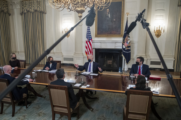 当地时间2021年3月24日,美国华盛顿特区,美国总统拜登、副总统哈里斯、卫生与公共服务部部长泽维尔·贝塞拉、国土安全部部长马约卡斯以及移民顾问等人在白宫出席会议。美国总统拜登当日在白宫宣布,授权副总统哈里斯领导处理美国和墨西哥边境非法移民问题。