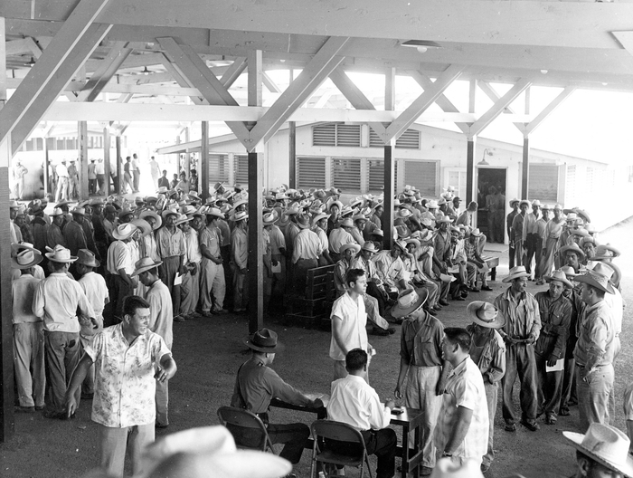 1957年,美墨边境,墨西哥农场工人(也被称为墨西哥短工)在美国移民官员处理工作的劳工中心排队等候。