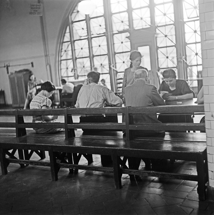 1951年,纽约市上纽约湾,移民坐在埃利斯岛移民检查站的长凳上。埃利斯岛是美国最繁忙的移民检查站的所在地。