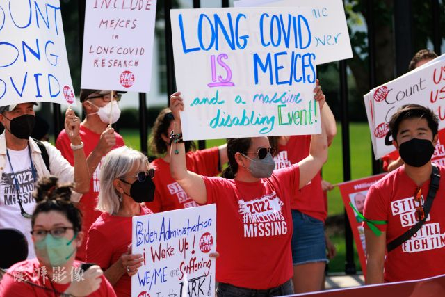 当地时间2022年9月19日,美国华盛顿特区,民众在白宫外进行抗议,举着标语反对拜登宣称“美国疫情结束”的言论。据悉,这群抗议者均是出现“长新冠”后遗症的人群。