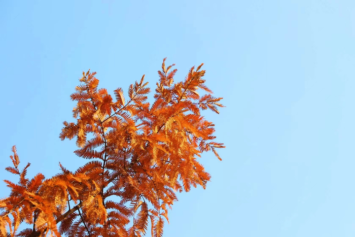 在秋冬交替的季节,高耸入云的水杉矗立在樱桃沟景区内,随着它穿上火红的外衣,不惧寒风肆虐,毅然成为景区内最为靓丽的一条风景线。