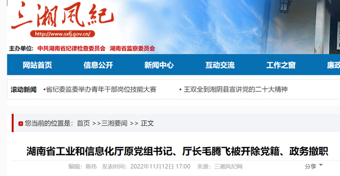据三湘风纪网11月12日通报,湖南省工业和信息化厅原党组书记、厅长毛腾飞被开除党籍、政务撤职。