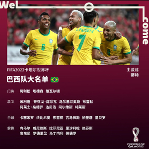 卡塔尔世界杯,巴西队同塞尔维亚队、瑞士队和喀麦隆队一组。北京时间11月25日3时,巴西队将迎来世界杯首场比赛,对手是塞尔维亚队。
