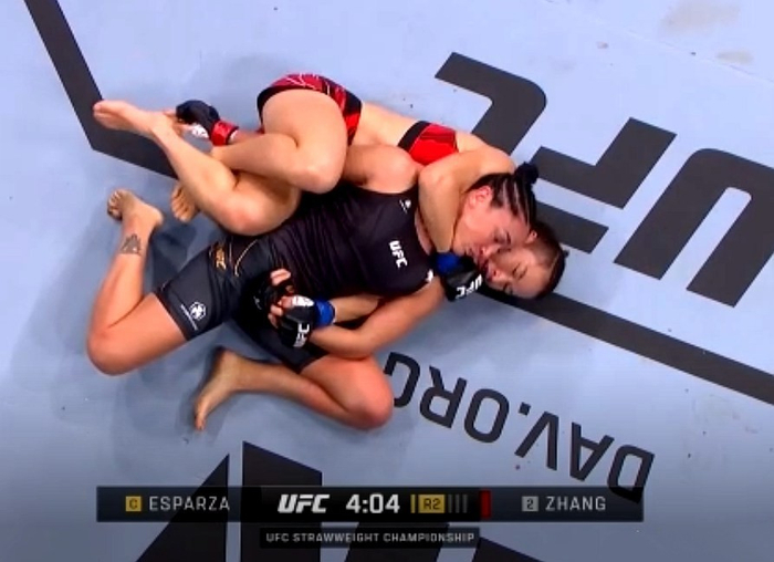 本场较量,身穿“中国红”比赛服的张伟丽依然伴随着中文歌曲《沧海一声笑》出场。首回合比赛,双方在经过半回合试探后开始发动攻势,张伟丽在一次起腿时被对方摔倒。此时,中国姑娘展现出备战成果,在地面缠斗中反客为主,不但扭转了不利位置,还通过击打重创对手,并尝试使出裸绞技术。该回合,埃斯帕扎两次将比赛拖入地面,但没有在擅长的位置占到丁点便宜,反而被张伟丽占据上风。