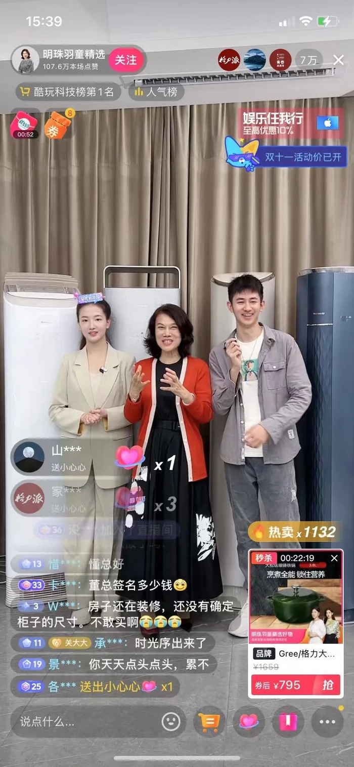 11月10日下午,格力电器董事长兼总裁董明珠与被称为其“接班人”的秘书孟羽童同台,现身抖音的“明珠羽童精选”直播间,开启今年双十一的冲刺促销。