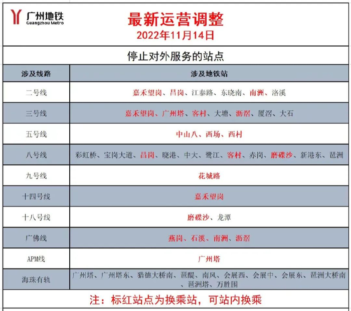 截至目前,广州地铁线网停止对外服务的站点可参考表格。