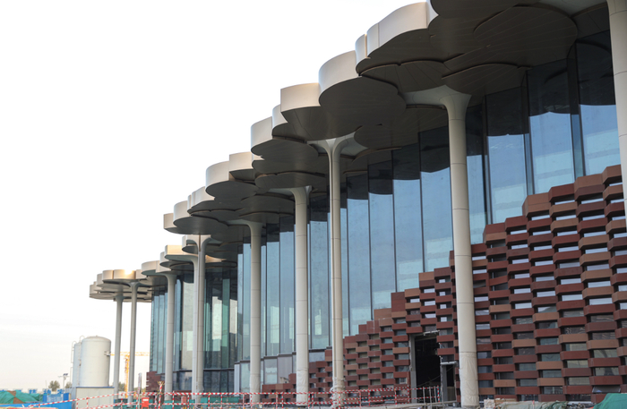 文杏栽为梁,香茅结为宇。由中国中铁建工集团承建的城市副中心图书馆,正以极富设计感的建筑形态在城市绿心拔地而起。矗立的银杏树状结构支撑起知识的空间,一枚枚银杏叶屋盖汇成赤色方正的人文印章。目前,北京城市副中心图书馆的外幕墙工程刚刚正式完工。中铁建工集团的匠心精筑,为千年运河文化着上了一抹亮丽的色彩。