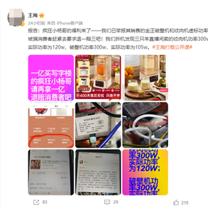 王海在11月12日发布微博称,已举报疯狂小杨哥销售的金正破壁机和绞肉机虚标功率。拆机发现三只羊直播间卖的绞肉机功率300W,实际功率为120W;破壁机功率300W,实际功率为150W。