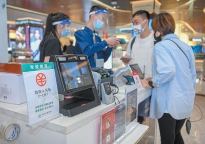2022年5月3日,顾客正在海南省海口市的免税商场内使用数字人民币进行结算。