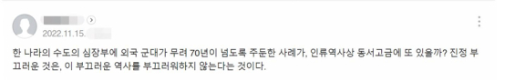还有人对驻韩美军基地持反对立场,写道:“外国军队在一个国家首都的中心地带驻军超过70年,请问这种事情古今中外还会再有吗?最让人感到羞愧的是,有人对这种令人蒙羞的历史一点都不感到羞愧!”↓