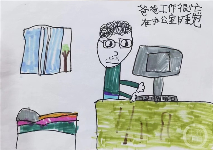 他说,女儿从小喜欢画画,老师鼓励孩子们用各种方式表达家庭成员抗疫的场景,她就很用心地画了一组。“每幅画都是她观察后对所见场景的理解和表达,画里面的元素真实准确,绿色行军床,书柜、窗帘等等,都是视频时她主动要求展示的,这次在画面中也有细致的表达。”