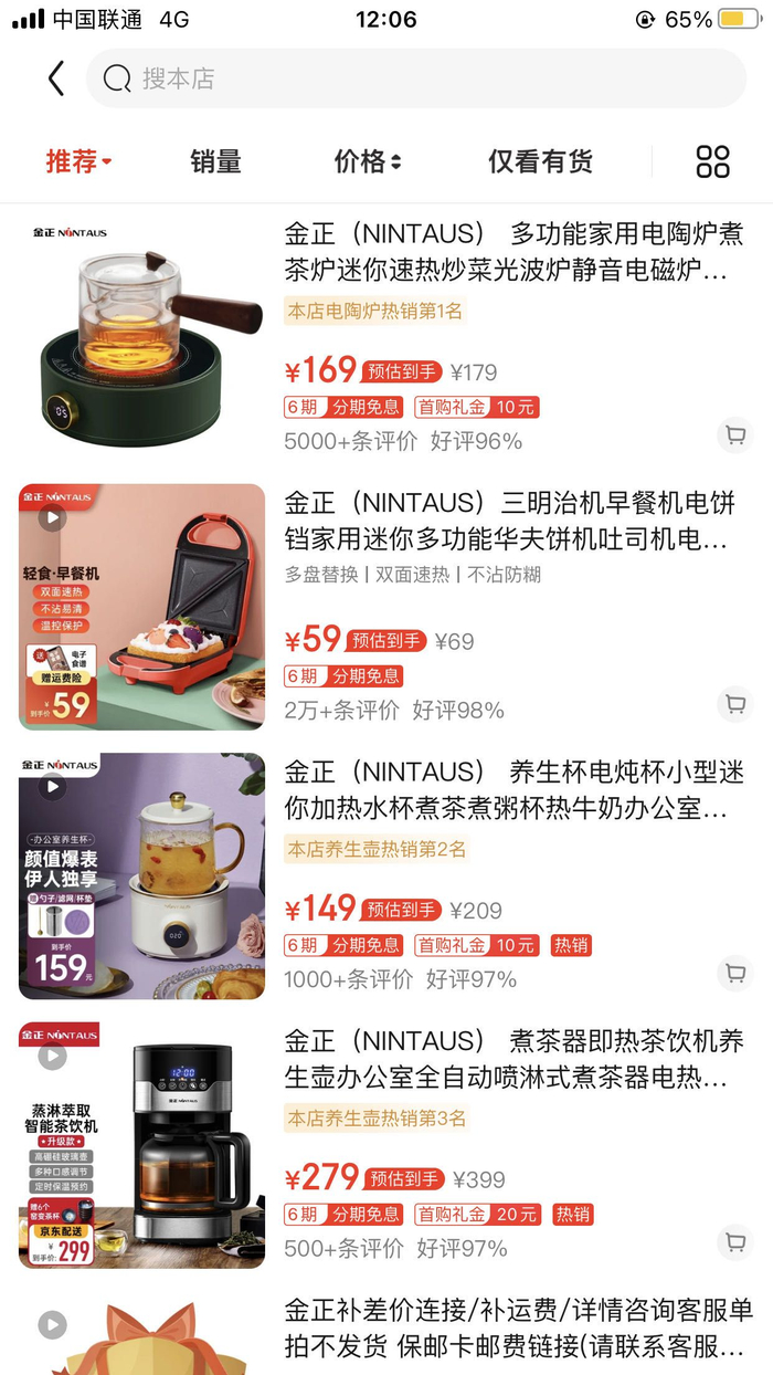 11月16日,新京报贝壳财经记者通过京东、天猫等电商平台金正官方旗舰店搜索,并未找到被此次涉事的金正绞肉机产品。京东金正官方旗舰店有一款在售的破壁机,售价599元,折后279元。