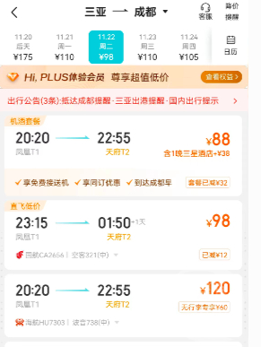 从三亚出发,直飞上海的价格也不高:春秋航空今日晚间出发的航班,价格为106元;11月22日,三亚飞成都的国航航班,最低价为98元,11月22日三亚飞南京的最低价为130元。
