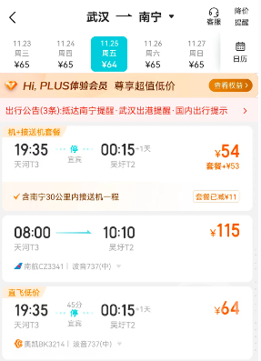 从武汉出发前往南宁,比三亚飞杭州的“地板价”机票贵不了多少:机酒套餐中,机票最低价为54元,仅机票最便宜64元,出发日期为 11月25日。