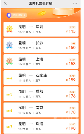 昆明飞往多地的机票价格都不超两百元。
