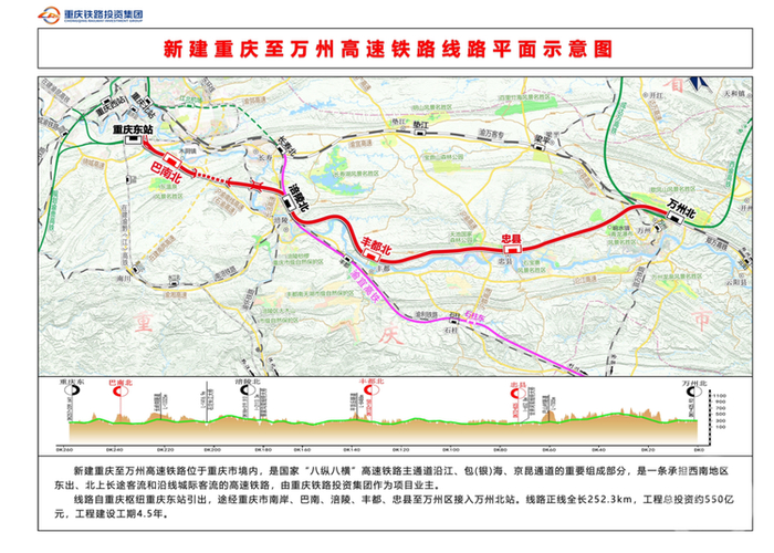 渝万高铁是国家“八纵八横”高铁网中,包(银)海、京昆、沿江等高铁主通道的重要组成部分,也是重庆“米”字型高铁网的重要组成部分。线路自重庆枢纽重庆东站引出,途经南岸区、巴南区、涪陵区、丰都县、忠县至万州区接入万州北站,沿线共设5个车站,设计时速350公里,其中涪陵北站、万州北站为既有站,重庆东站为在建站,丰都北、忠县站为新建站。