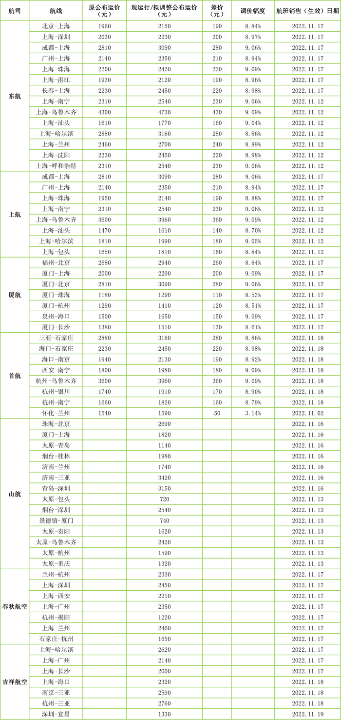 据东航官网显示,今年11月12日起,东航上航对上海往返乌鲁木齐、汕头、沈阳等12条航线经济舱公布运价进行上调;11月17日起,东航上航又对包括京沪、沪广等在内的10条航线经济舱公布运价上调,上调幅度在190元至280元、厦航则从11月17日起调整厦门往返北京、上海、杭州等7条航线的公布运价,首航从11月18日起调整了三亚往返石家庄、杭州往返乌鲁木齐等7条航线的公布运价。上述航线的调整幅度在120元至360元。