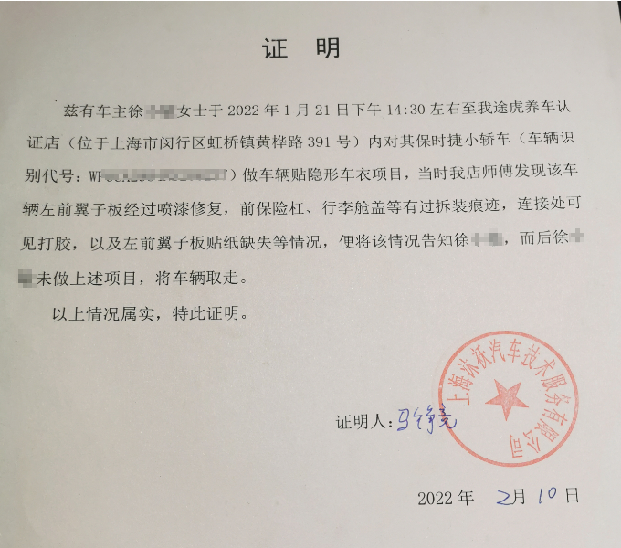 养车店出具的证明。徐女士回忆,大约半小时后,她就接到养车店师傅打来的电话,说车子可能补过漆甚至存在零部件拆装的情况,他们不敢动,让徐女士尽快过来看看。次日,在养车店师傅的建议下,徐女士找了家鉴定中心,将车辆送去进行车体痕迹鉴定。