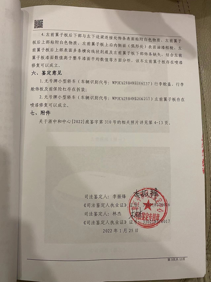浙江中和司法鉴定所出具的《司法鉴定意见书》。浙江中和司法鉴定所于1月25日出具的《司法鉴定意见书》显示,经使用内窥镜、涂镀层测厚仪等仪器鉴定,徐女士所购的汽车行李舱盖、行李舱饰板及前保险杠存在拆装;车辆左前翼子板存在喷漆修复可以成立。
