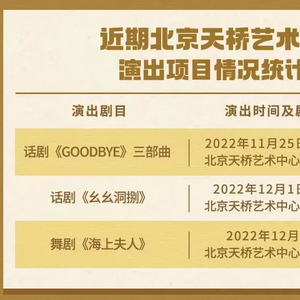 注:话剧《GOODBYE》三部曲和舞剧《海上夫人》这两个项目凡通过北京天桥艺术中心官方平台(东售票厅、官网、官方微信)及大麦网、猫眼、中演票务通、中票在线、新影联票务、保利票务、票星球等北京天桥艺术中心票务合作平台购买的门票支持座位平移保留。