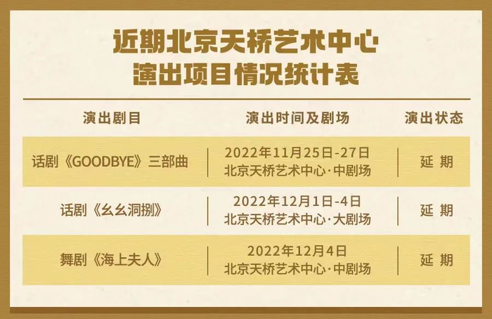 新京报讯 据北京天桥艺术中心官微消息,根据最新疫情防控工作有关要求,为积极配合防疫工作部署及相关要求,保障广大观众和演职人员的健康与安全,经多方协商,我们很抱歉地通知您,原定于2022年11月25日—12月4日在北京天桥艺术中心举办的部分演出将延期或取消。由此给您带来的不便我们深表歉意,感谢您的理解与支持!