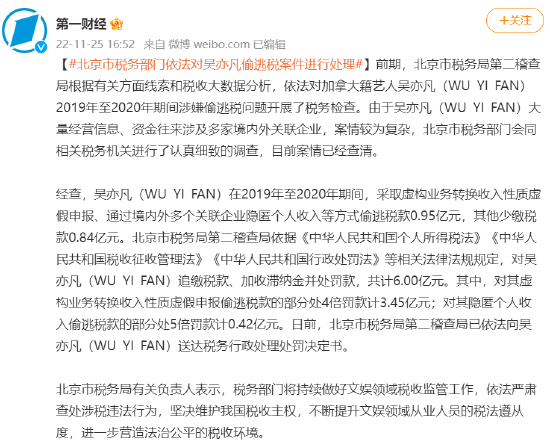 经查,吴亦凡(WU YI FAN)在2019年至2020年期间,采取虚构业务转换收入性质虚假申报、通过境内外多个关联企业隐匿个人收入等方式偷逃税款0.95亿元,其他少缴税款0.84亿元。北京市税务局第二稽查局依据《中华人民共和国个人所得税法》《中华人民共和国税收征收管理法》《中华人民共和国行政处罚法》等相关法律法规规定,对吴亦凡(WU YI FAN)追缴税款、加收滞纳金并处罚款,共计6.00亿元。其中,对其虚构业务转换收入性质虚假申报偷逃税款的部分处4倍罚款计3.45亿元;对其隐匿个人收入偷逃税款的部分处5倍罚款计0.42亿元。日前,北京市税务局第二稽查局已依法向吴亦凡(WU YI FAN)送达税务行政处理处罚决定书。